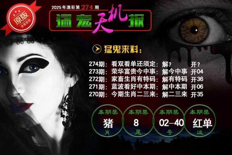 274期猛鬼天机报:【看双看单还须定】 ①推荐生肖:猴羊蛇牛狗龙 ③绝杀半波:红单 |